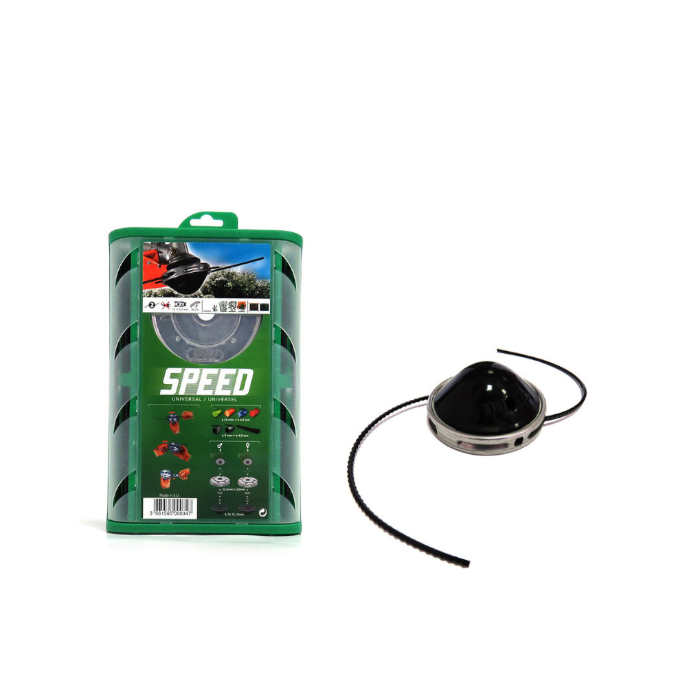 Testina in alluminio a 2 fili universale, completa di rondelle adattatori - per decespugliatori di cilindrata superiore ai 20cc. Confezione singola da esposizione. In dotazione n° 4 spezzoni da 26 cm di filo quadro seghettato del diametro di 3,5 mm. Filo consigliato: r302165 - r302166 - testine multifilo “speed” universali senza passafilo. Queste nuove testine super professionali in alluminio possono essere montate su tutti i tipi di decespugliatori con rotazione sinistra. Le rondelle in dotazione rendono semplice e universale il montaggio, senza l'utilizzo di inserti, sia con attacco maschio che femmina. Nel corpo superiore in alluminio si possono inserire tutti i profili di filo, da diametro 2,00 mm a 4,00 mm, che vengono bloccati mediante appositi cricchetti blocca filo. Il corpo inferiore, di forma conica e prodotto con materiale plastico resinoso altamente resistente all'usura, si assembla al corpo superiore della testina mediante una semplicissima operazione.