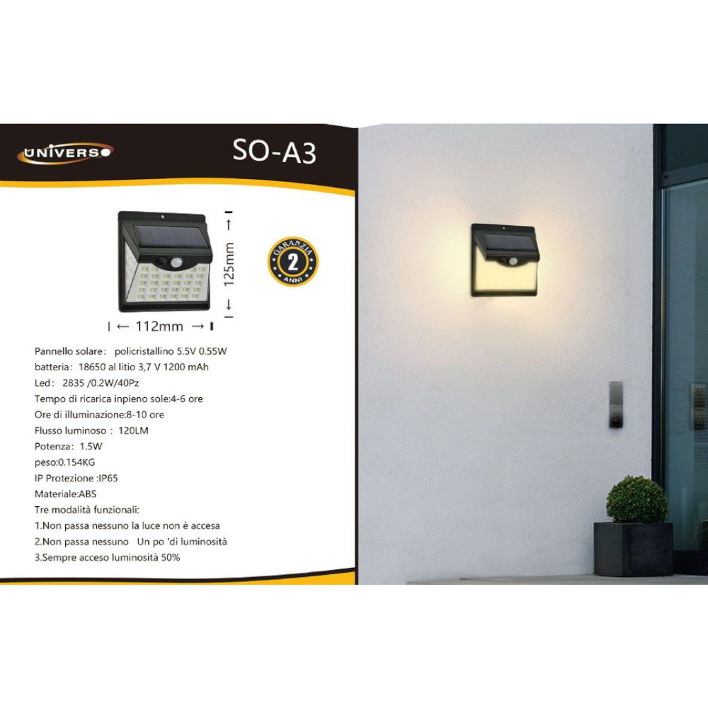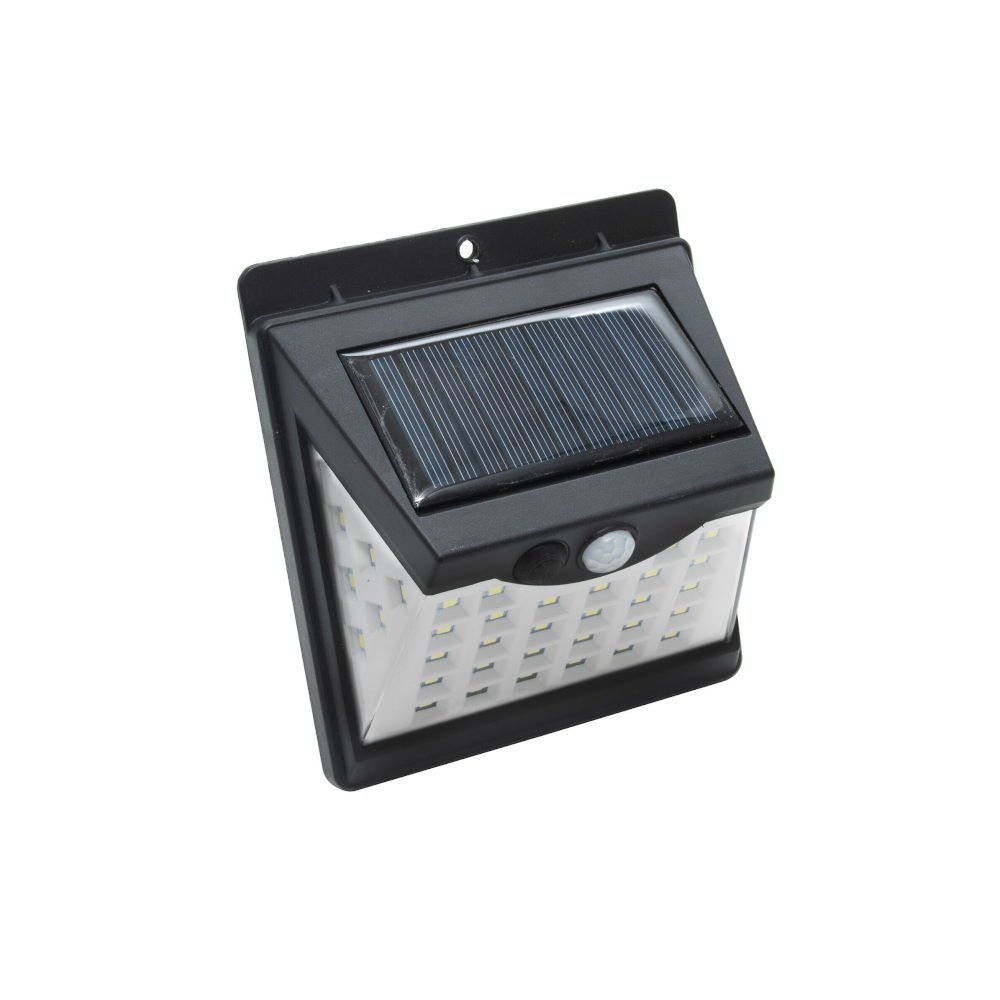Faretto per esterno in ABS nero dotato di 40 LED 2835 ad alta luminosità ideale per l'illuminazione esterna di abitazioni per illuminare ingressi, per l'illuminazione del giardino. Non richiede installazione, semplice da applicare, si alimenta tramite il pannello solare posto sulla parte superiore che ricarica la batteria interna. Ideale in tutti quei posti dove c'è bisogno di una fonte luminosa e non c'è possibilità di collegamento alla rete elettrica.