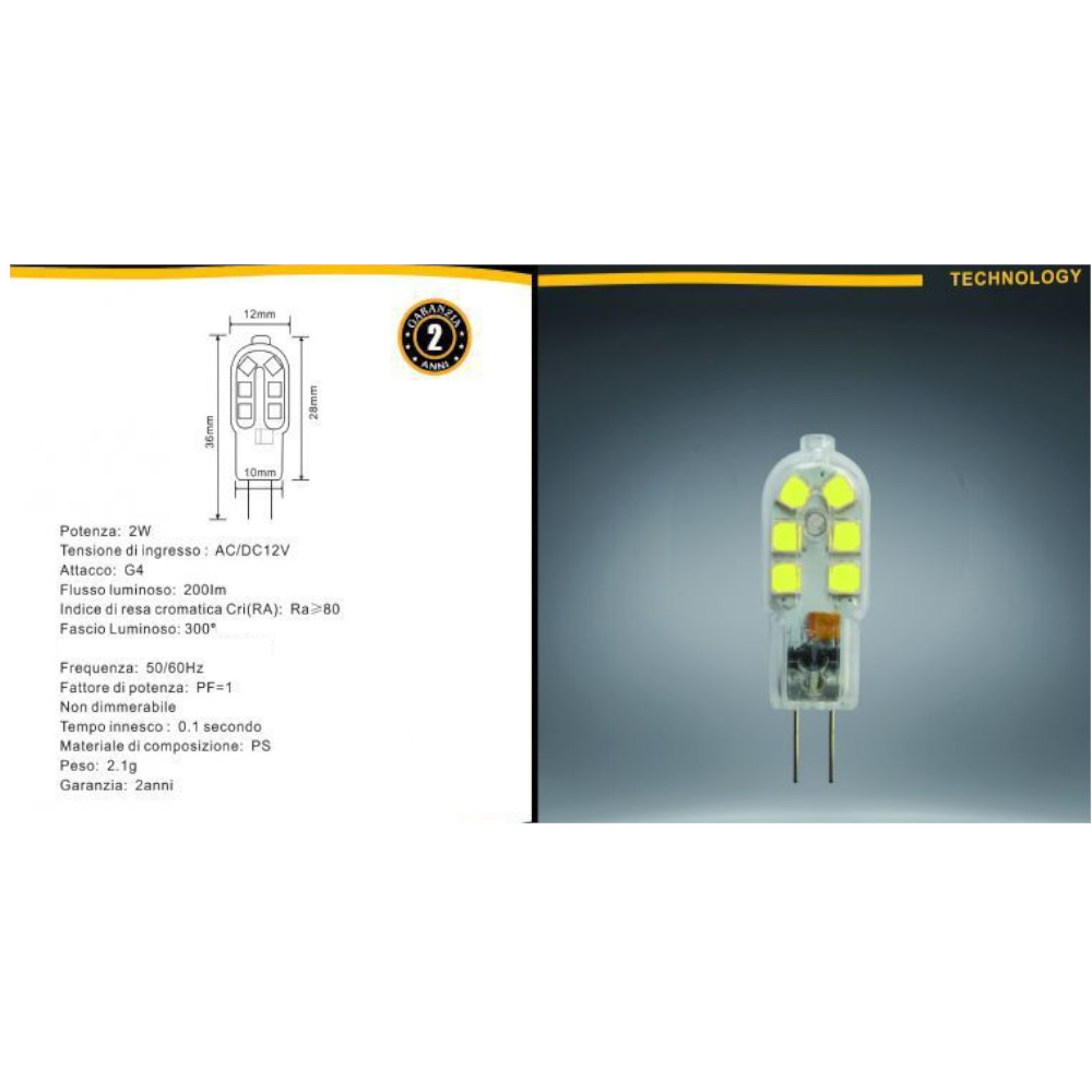 Lampadina led G4 2W SMD modello G4-05 equivalente a 20W di una lampadina ad incandescenza con fascio luminoso di 300° e flusso luminoso di 200 lm. Dimensione: Ø 12 x 36 mm