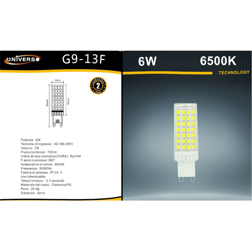 Lampadina led G9 6W equivalente a 72W di una lampadina ad incandescenza con flusso luminoso di 720 lm. Dimensione: Ø 16 x 64 mm