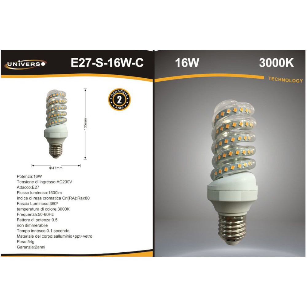 Lampadina LED a Spirale, a ridotto consumo energetico, permette di risparmiare fino al 90% rispetto alle classiche lampadine a incandescenza infatti 16W Led equivalgono a 160W di una vecchia lamapadina ad incandescenza