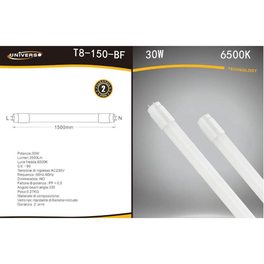 Tubo LED T8 con potenza di 30W e attacco G13. Lunghezza 150 cm con copertura in vetro satinato, fascio luminoso di 330°, flusso luminoso di 3500 lm e un rapporto di 115 lm/W.