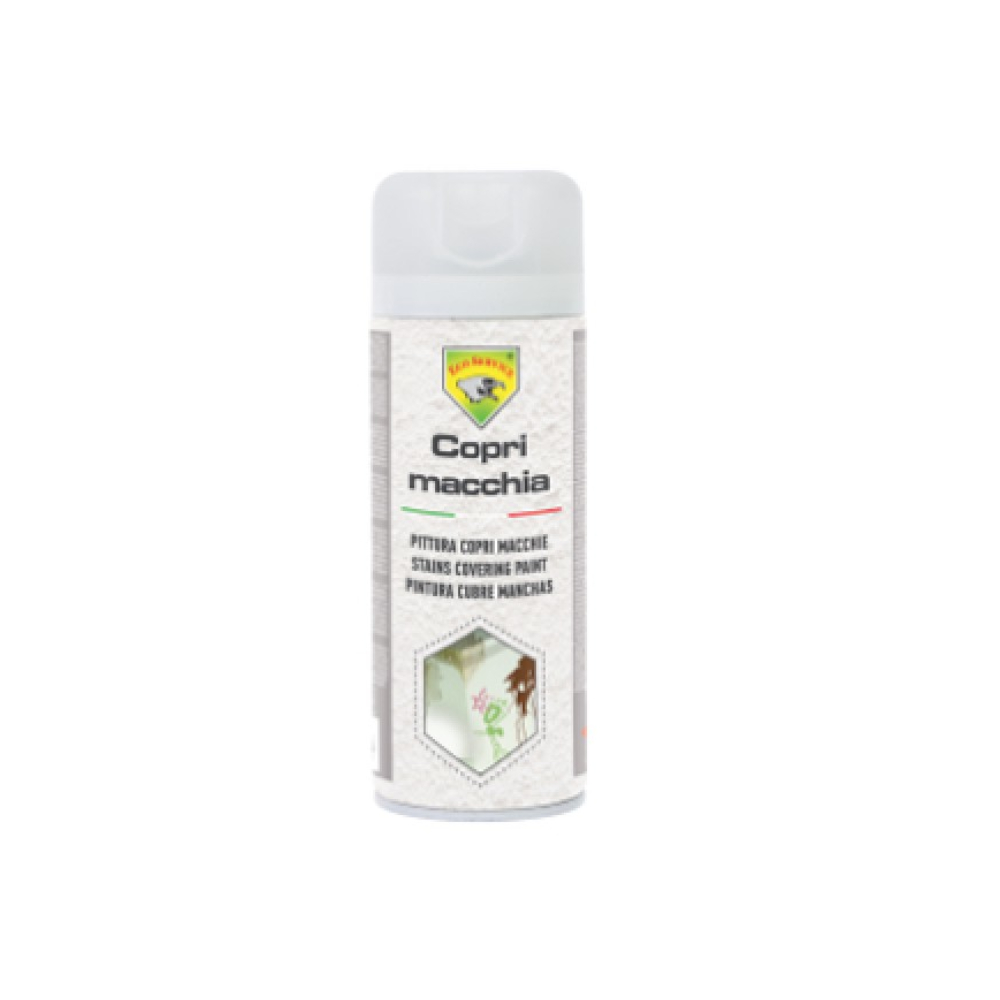 Copri macchia Spray: Pittura speciale formulata per coprire diversi tipi di macchie all’interno e all’esterno. Indicata contro le macchie di nicotina, fuliggine, olio, salsa di pomodoro, vino rosso, aceto di vino, the, caffè, rossetto, pastelli normali e a cera, matite, pennarelli ad acqua e solvente. Può essere utilizzata anche come mano a fi nire per rinnovare e rinfrescare pannelli e controsoffi ttature in gesso e cartone. La valvola multi direzionale a 360° permette di spruzzare il prodotto in tutte le direzioni con estrema precisione anche nei luoghi di diffi cile accesso. Sopra verniciabile con il medesimo prodotto in ogni momento, con altri prodotti dopo minimo 24-30 ore e non sopra verniciabile con vernici bicomponenti.