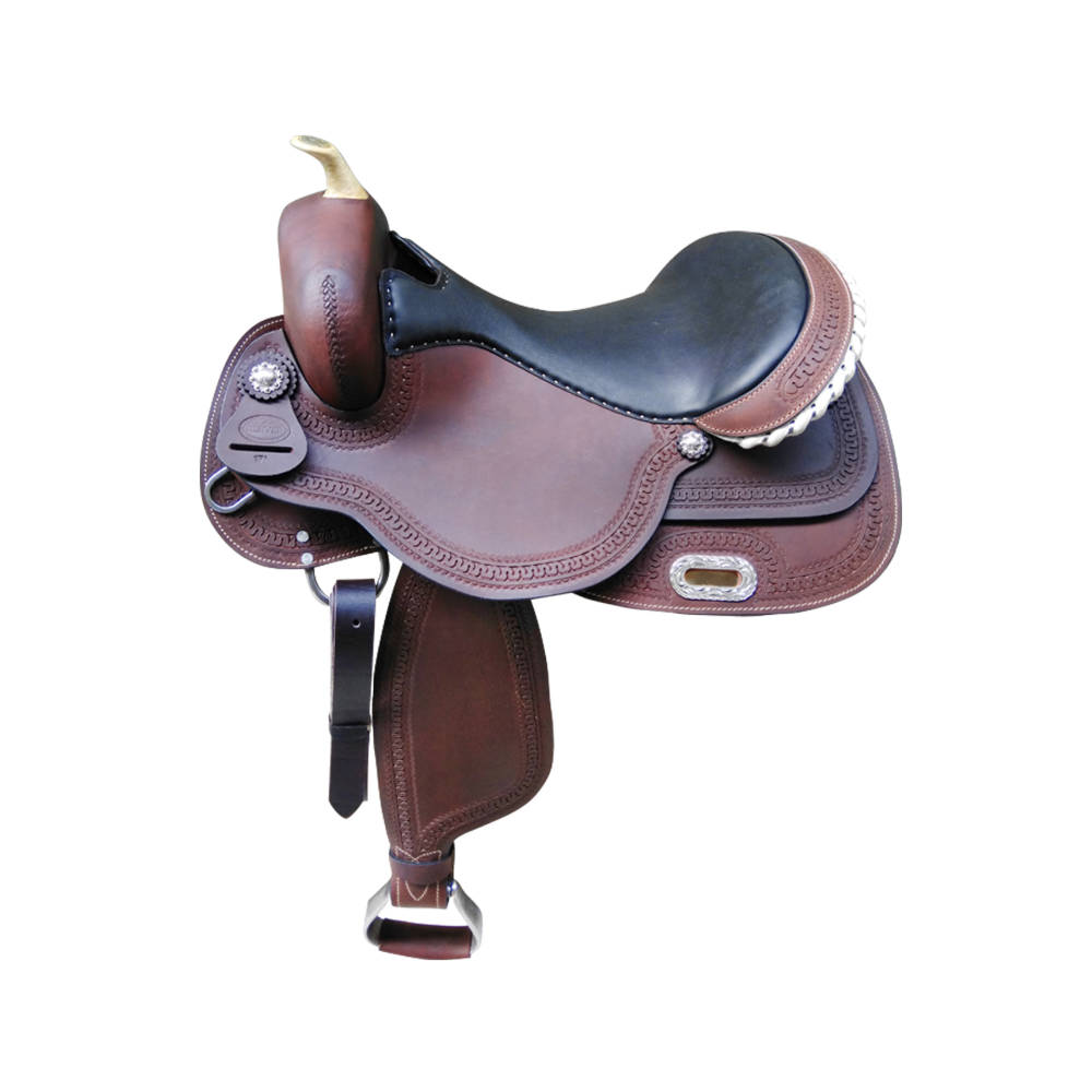 Sella western Denver modello Reiner+ seggio in pelle liscia, cuoio ingrassato, lavorazione border stamp e riporti in rawhide, arcione in ralide.