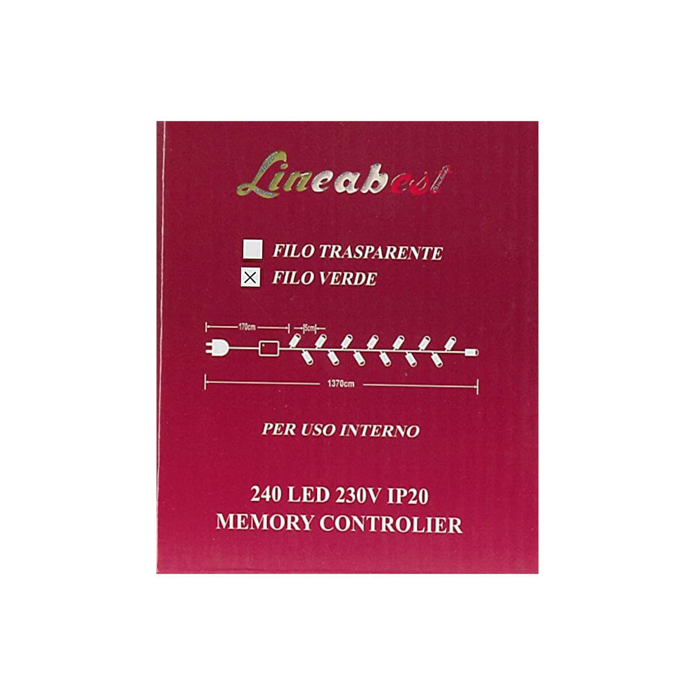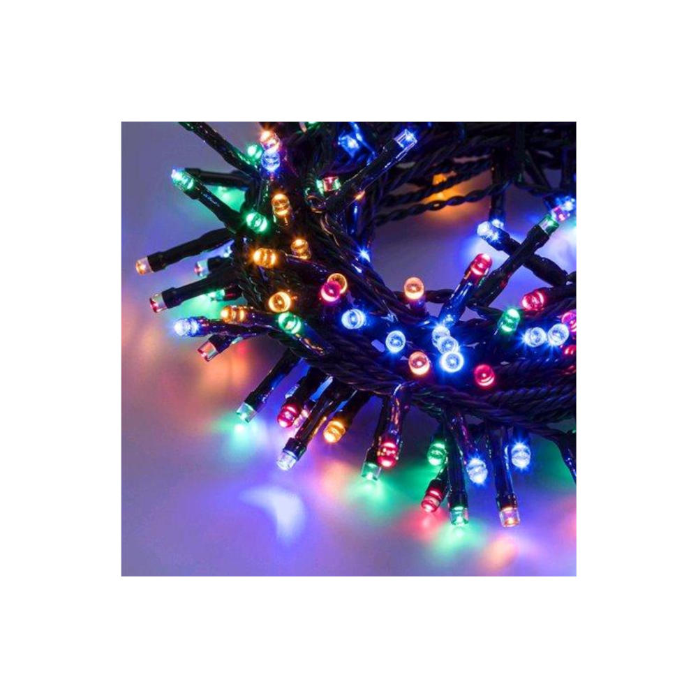 Striscia di 240 luci led per albero di Natale o presepre, luci multicolor controllabili nella loro frequenza tramite il controller. Il filo in gomma è di colore verde.