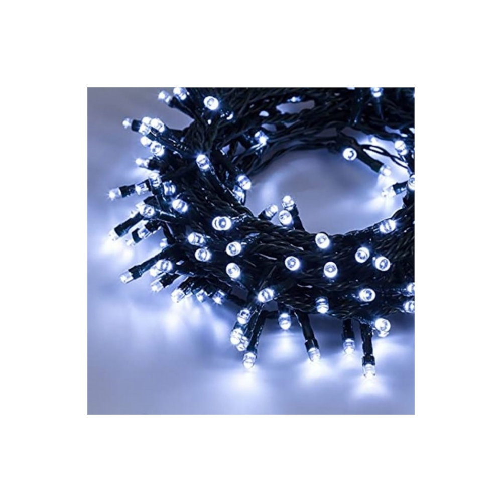 Striscia di 100 luci led per albero di Natale o presepre, luci di colore bianco controllabili nella loro frequenza tramite il controller. Il filo in pvc è di colore verde.