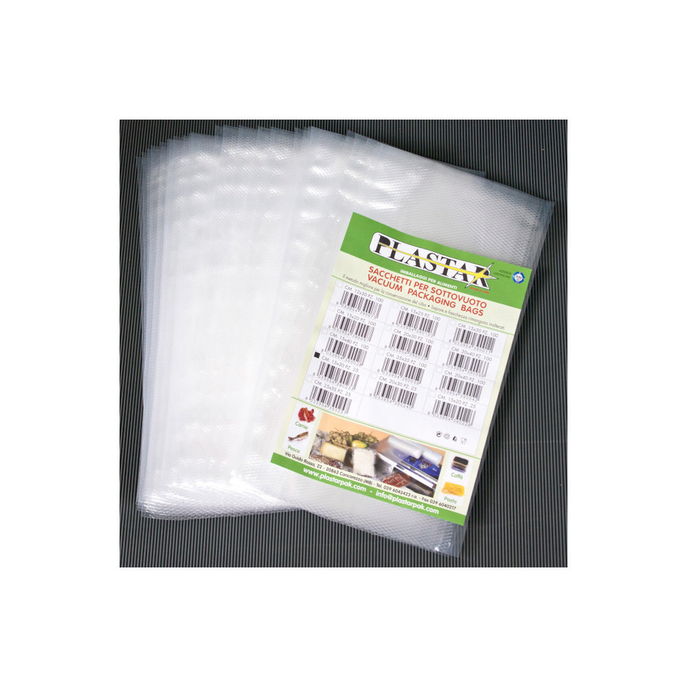 Il lato della busta goffrato permette la fuoriuscita rapida dell’aria in modo da allungare la conservazione del prodotto contenuto.