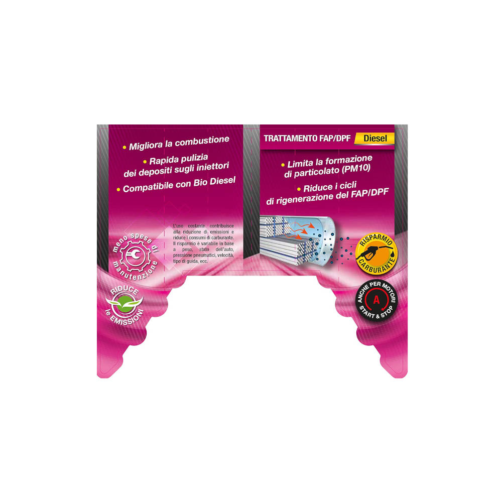 L'additivo Diesel Trattamento FAP/DPF riduce la produzione di PM10, migliora la combustione e fa in modo che il filtro antiparticolato si sporchi meno.