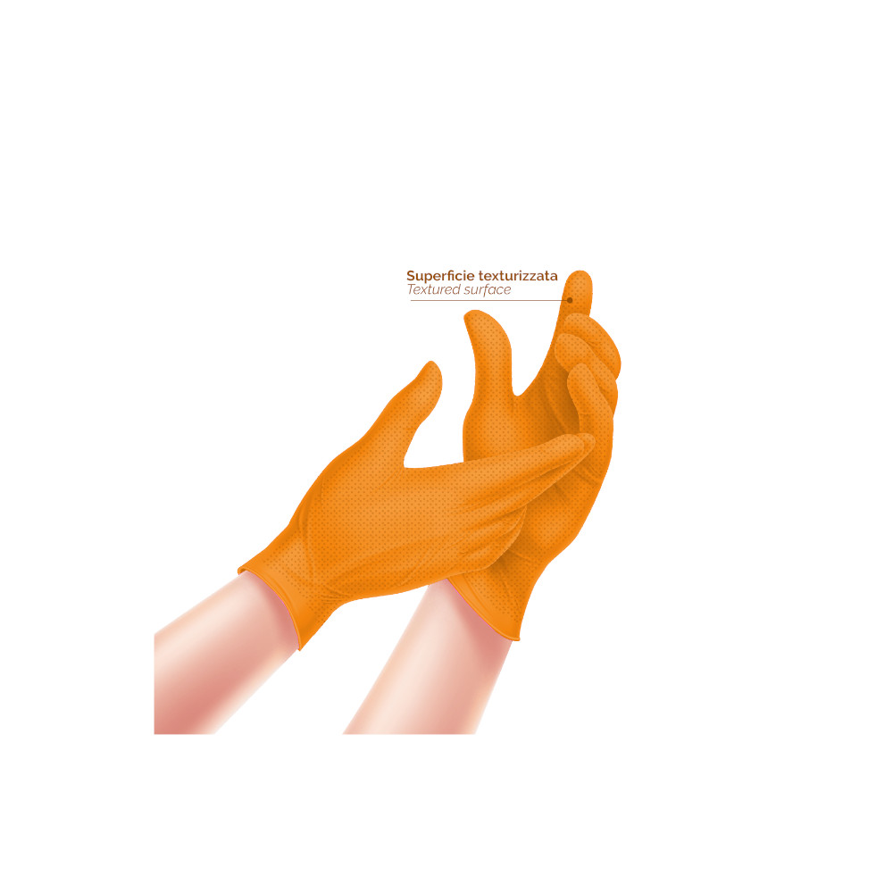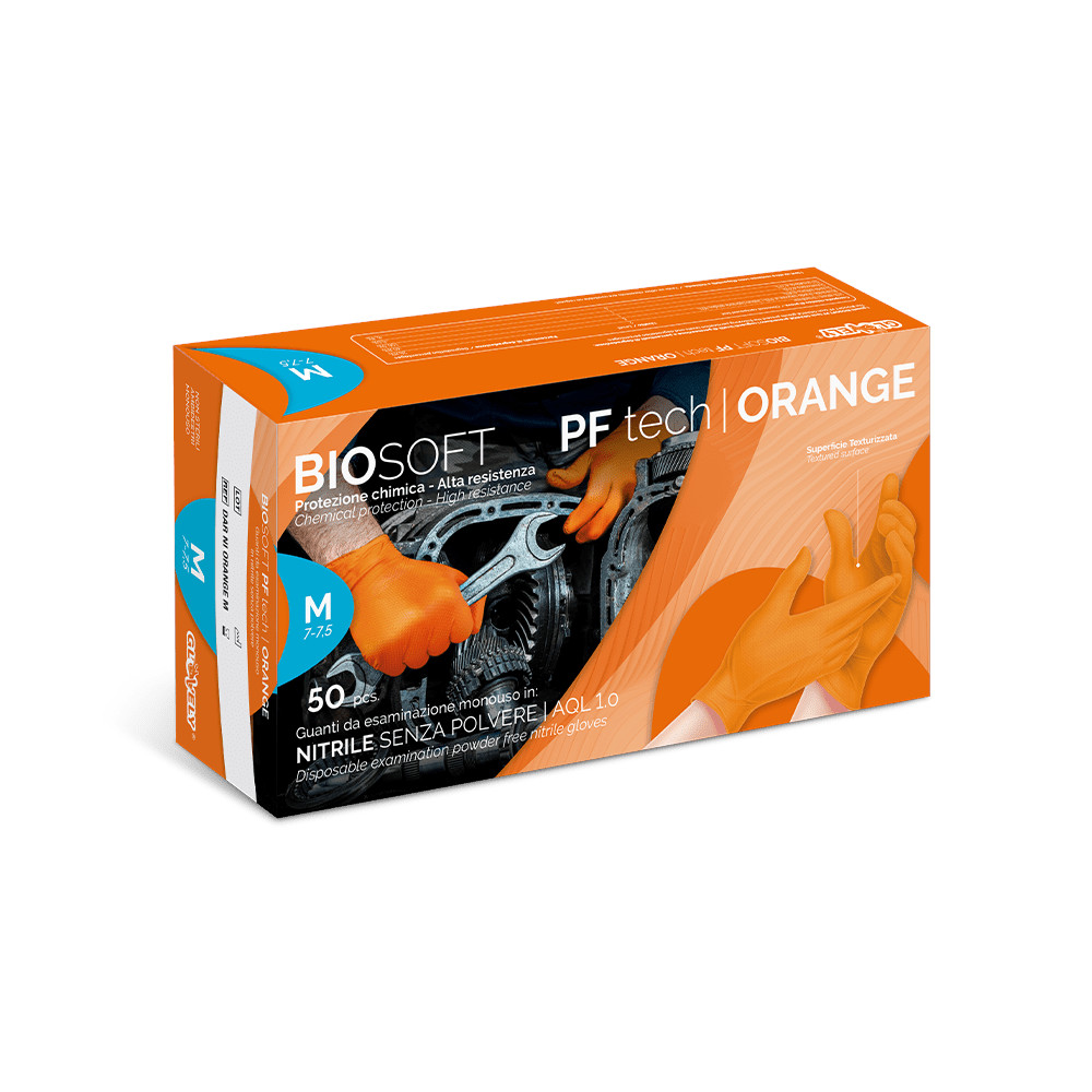 Guanti da esaminazione ed esplorazione in nitrile, monouso, non sterili, privi di polvere lubrificante, internamente clorinati, colore arancione, forma anatomica intercambiabile destra e sinistra ambidestri) e superficie testurizzata 3D a diamante sull’intero palmo. I polsini hanno un bordino elastico anti-arrotolamento che rinforza l’estremità del guanto, ne aumenta la vestibilità ed Impedisce alla manichetta di arrotolarsi. I guanti BIOSOFT TECH ORANGE sono realizzati a corpo unico, quindi privi di saldature e di sbavature, hanno un’ottima consistenza, elasticità e morbidezza tali da garantire una perfetta aderenza ed un’ottima sensibilità all’operatore. La speciale superficie testurizzata su tutto il palmo conferisce ai guanti un grip eccezionale. Lo spessore ed il peso elevato li rendono molto resistenti ed idonei per usi pesanti. Il colore arancione aumenta la visibilità e facilita l’utilizzatore in condizioni di scarsa illuminazione. Grazie all’elevata biocompatibilità ed ergonomicità, permettono un uso prolungato senza affaticamento. Inoltre i guanti sono idonei al contatto alimentare per diverse tipologie di alimenti. Peso 8.4 g ± 0.2 (taglia M), spessore medio 0.20 mm.