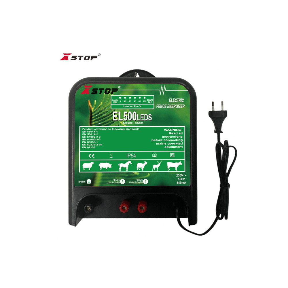 L'elettrificatore LED EL500 fornisce potenza lungo 120 km di filo di recinzione in condizioni ideali ed è facile monitorare la perdita di tensione della recinzione con spie a LED.