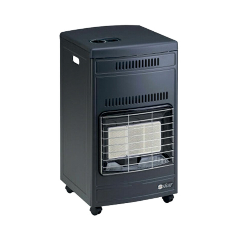 A gas GPL. Accensione piezoelettrica. Ventilata. Potenza max 4.200W. Consumo orario gas 305 g/h. Pressione 28-30 Mbar. Volume riscaldabile max 110 mc. Posizioni scaldanti 3. Interruttore luminoso. Dimensioni 40,5 x 44,5 x h 77 cm. Colore grigio. Peso 14,5 kg.